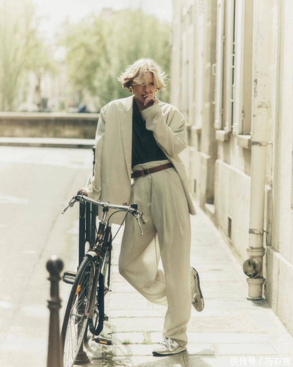 在单品款式的选择上,大家可以考虑西装外套,以休闲为主的宽松廓形设计,遮肉显瘦又不会过于正式。
