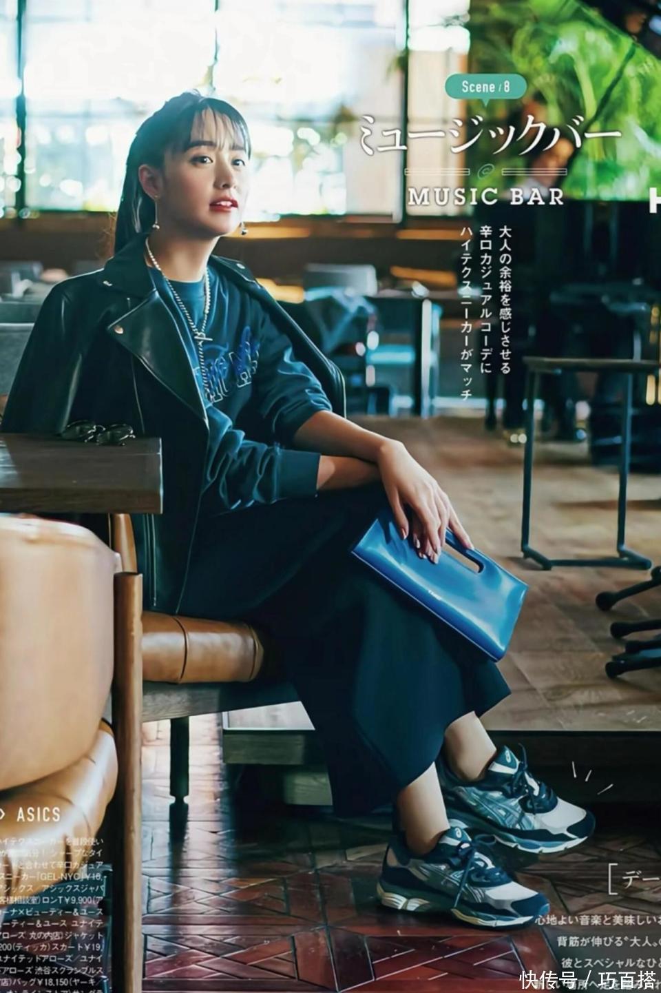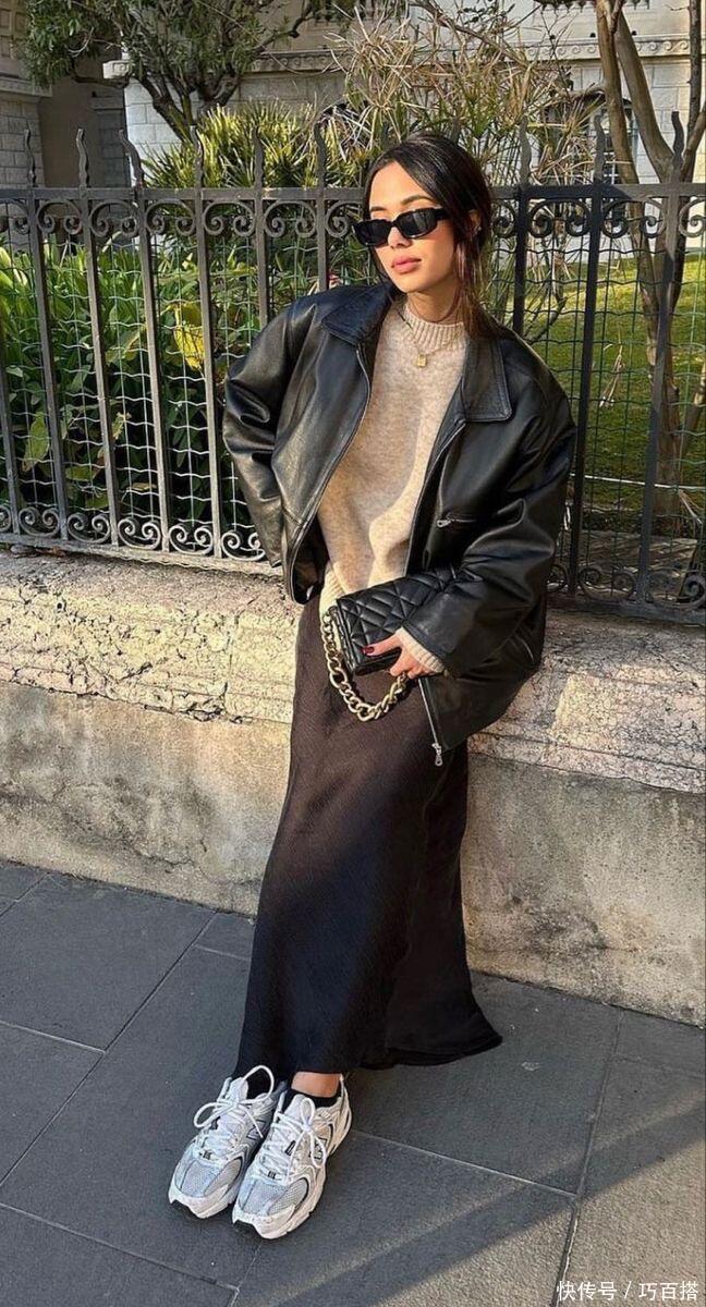 在单品配色的选择上,经典黑白配是最佳选择,黑皮衣白色运动鞋对任何人都非常友好,年轻女孩、上班族都能借鉴。