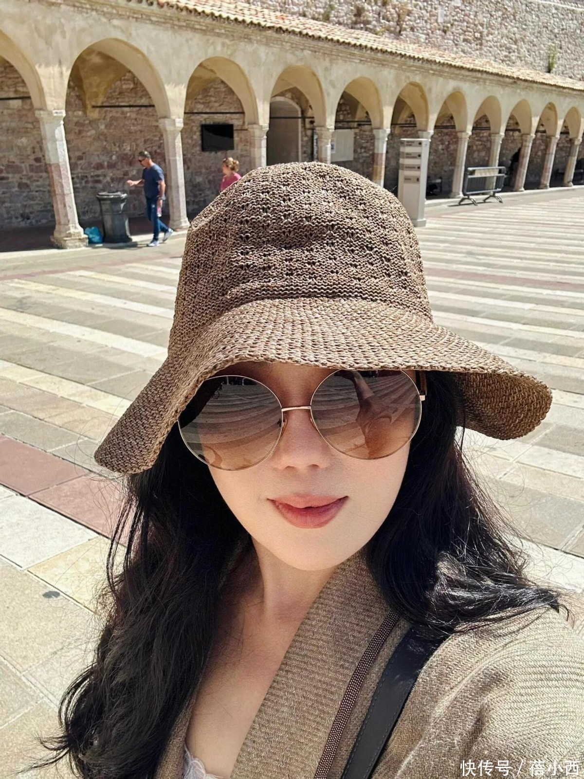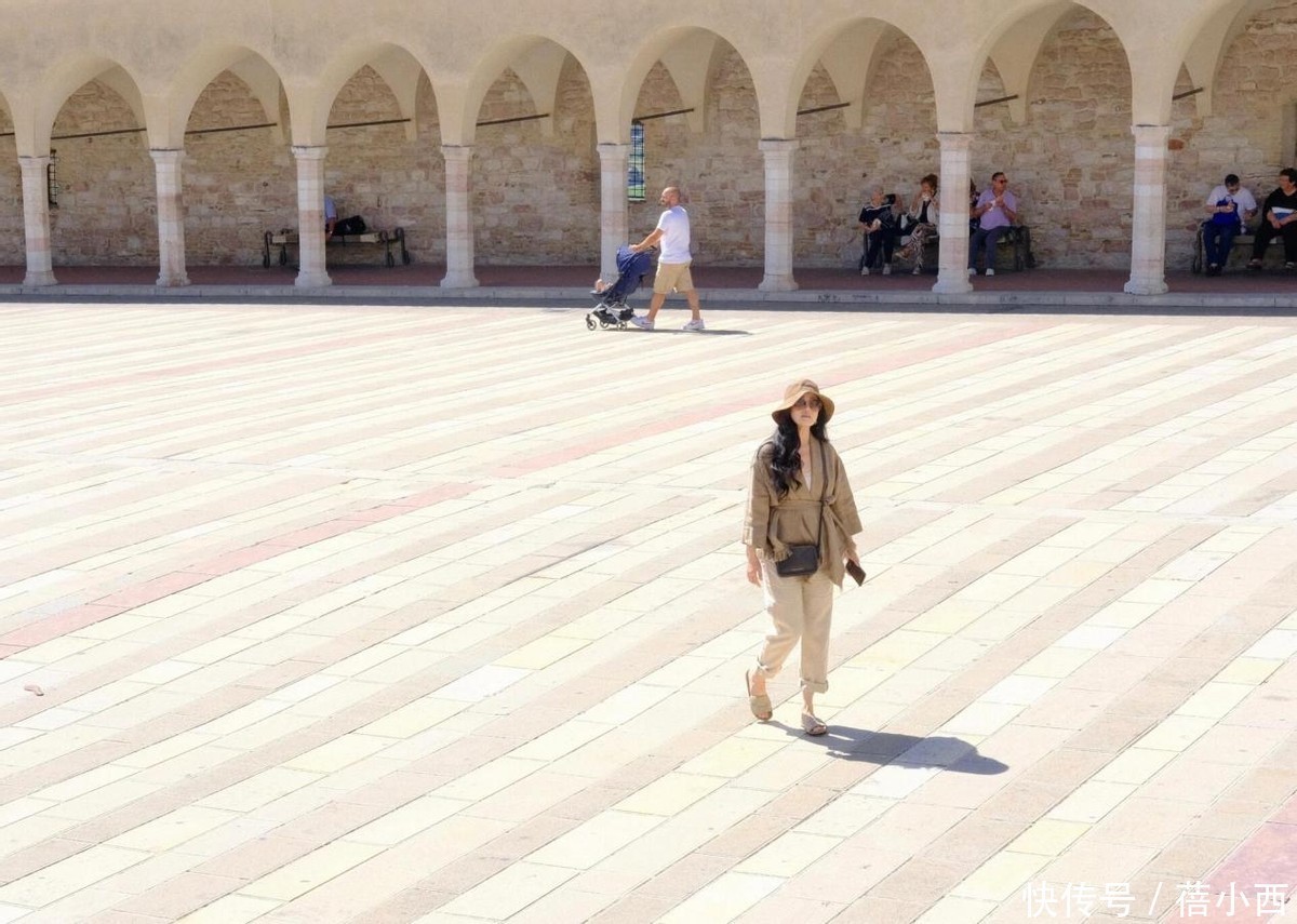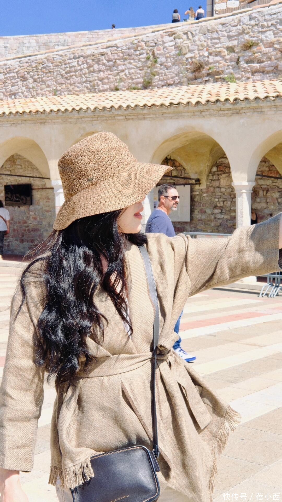 章小蕙漫步在国外的街头巷尾,沐浴着温暖的阳光,微风轻轻拂动她的发丝,她上身穿着一件宽松的燕麦色外套,柔和的色调如同春日里田野上的晨雾,给人一种宁静而温暖的感觉,戴着宽檐帽,真的很洒脱大方。
