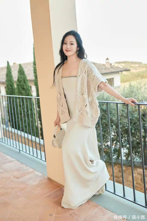 再瞧她身穿米色针织开衫搭配同色系抹胸长裙的造型,更是美呆了。米色针织开衫细节上的设计感十足,镂空的编织花纹精致细腻,短袖设计在展现温柔气质的同时又带着几分随性。镂空花纹让整体不显得沉闷,增添了空气感与轻盈感,再内搭抹胸连衣裙,流畅的线条贴合身体曲线,大方地展现出优雅的肩颈线条与曼妙身姿。