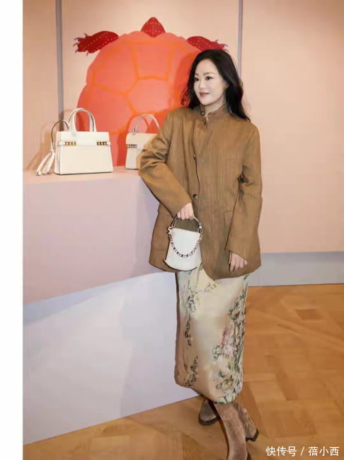 章小蕙的搭配总是低调却富有内涵,比如这一身棕色中式外套,立领设计端庄典雅,中式盘扣点缀其间,散发着浓郁的东方古典韵味。在下半身则搭配的印花半裙,底色柔和,上面的花卉图案栩栩如生,与棕色外套相互呼应,既有中式的含蓄内敛,又有印花带来的灵动活泼。