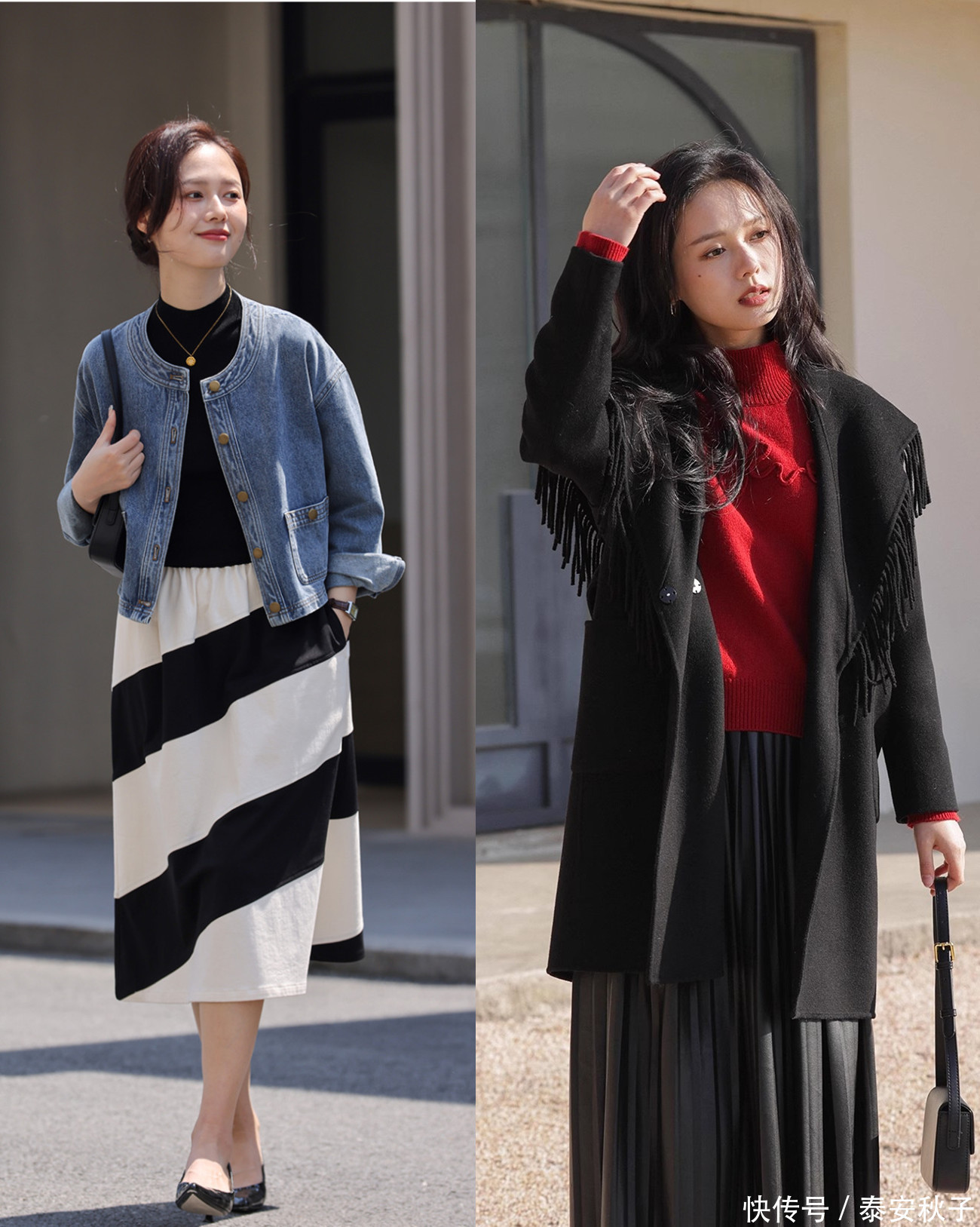 40岁左右的成熟女性们,可以借鉴博主“上短下长”的穿衣方式,用“赛衣角”的手法,搭配轻薄针织衫,营造出显高又显瘦的视觉效果。