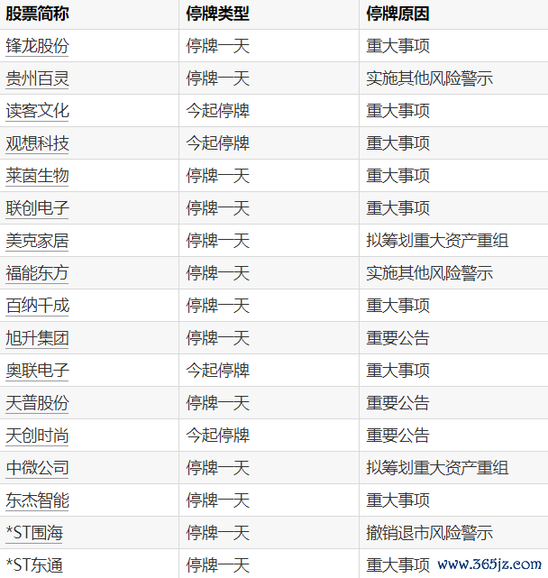 A股停牌提示:17股今日停牌A股停牌提示:17股今日停牌